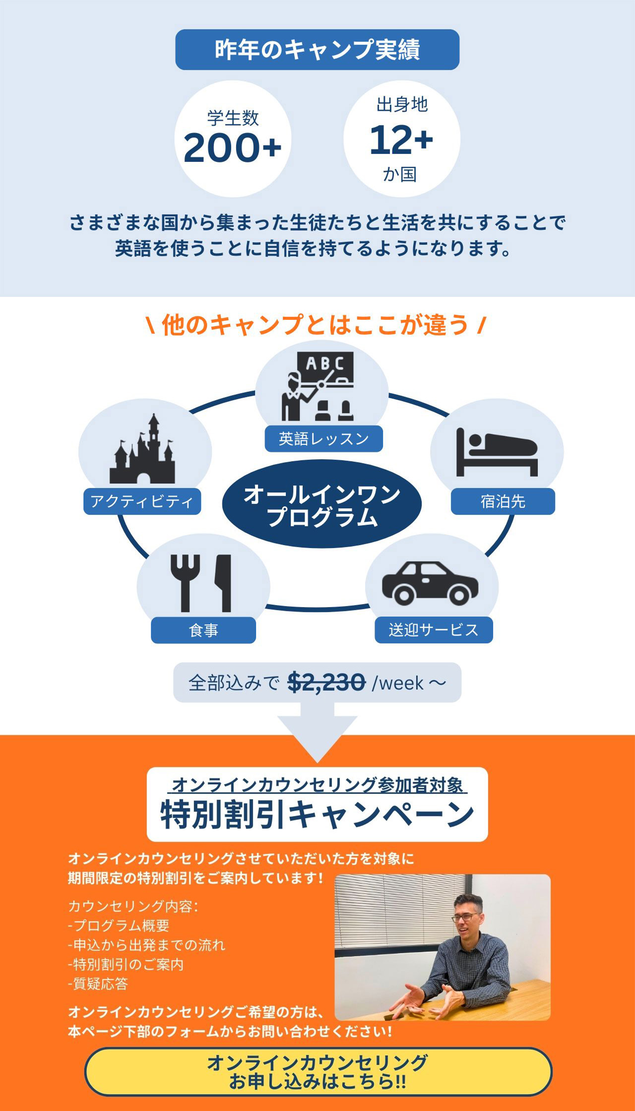 しかし、このキャンプはそれらを一つのパッケージで提供します。実践的な英語プログラムに参加することで、世界中から集まった学生と交流し、グローバルステージで活躍するための経験を得る機会を持つことができます。このユニークな機会は、典型的な短期旅行や海外留学と比較して比類のないものです。